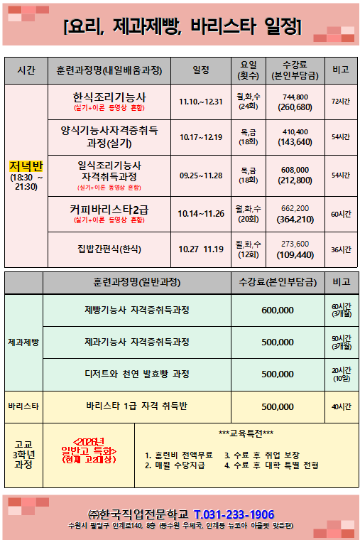 한국직업전문학교 10월(수정) 개강일정표